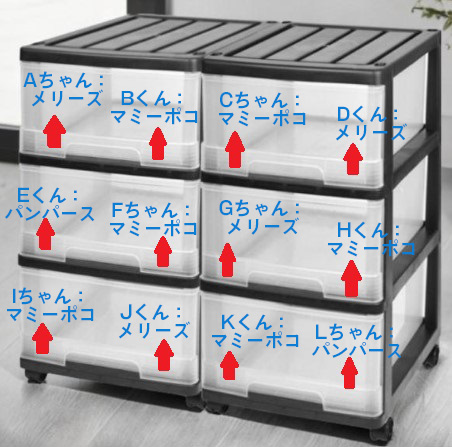 保育園ではこんな感じのおむつ入れの棚に、それぞれの家庭から持ってきたおむつを収納します。